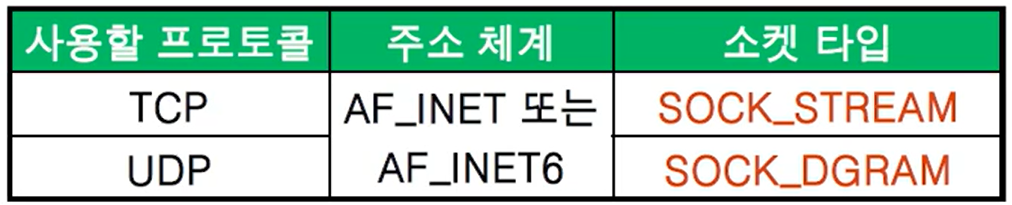 사용할 프로토콜에 따라 socket( ) 함수의 첫번 째 인수로 전달