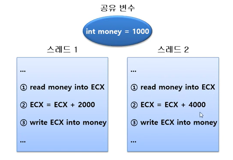 스레드 2도 money 값을 읽습니다. 초기값은 여전히 1000- 스레드 2의 레지스터(예: ECX)에도 1000이 저장