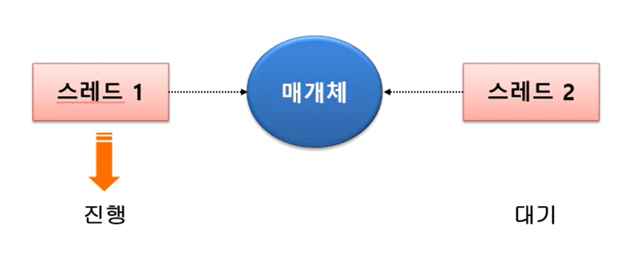 스레드를 동기화 하려면 스레드가 상호 작용해야 하므로 그림 처럼 매개체가 필요하다.